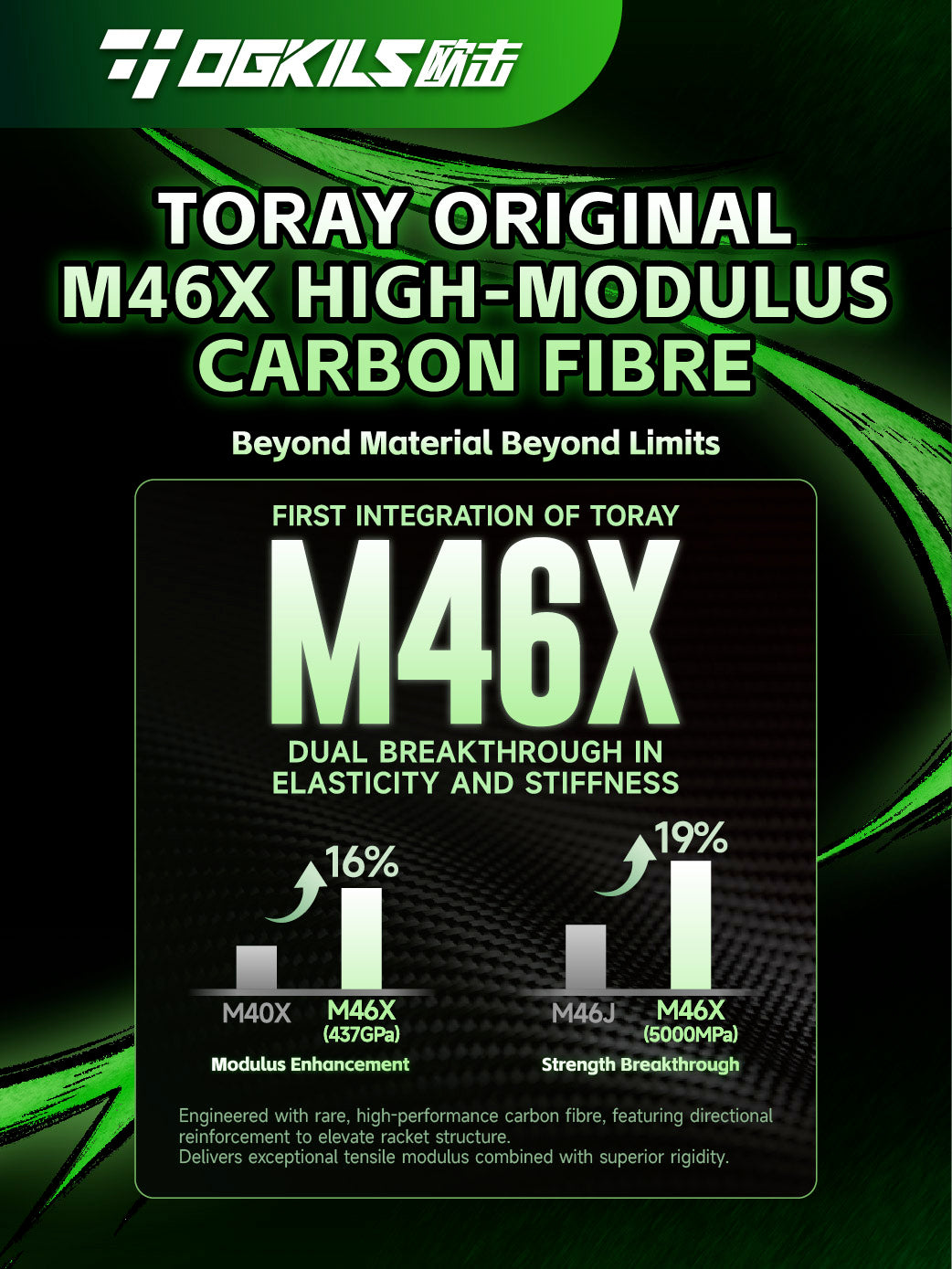 | Material Science | Toray M46X | Constructed with premium M46X carbon fiber, delivering exceptional strength, fast repulsion, and a crisp hitting feel for advanced players. |